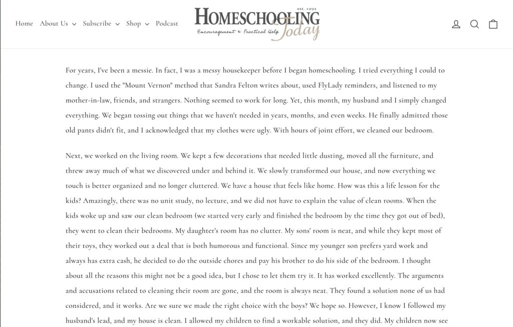 You see, I was pretty much a hoarder back then. I’d like to give you a watered-down side of the story, but I really wasn’t neat. I collected stuff I would never use. Things got dusty, dirty, and eventually needed to be trashed. Roaches came and went, and came back again. I tried very hard to improve my home, but in general, it was pretty bad. I lived in constant fear of being found out by people who might try to shut down our amazing adventure in homeschooling.